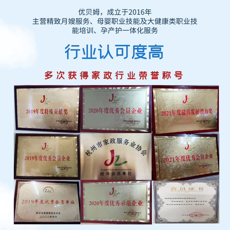 杭州優(yōu)貝姆健康管理有限公司,成立于2016年,是一家致力于打造集定制居家月嫂服務(wù)、孕產(chǎn)護一體化服務(wù)、母嬰健康管理培訓(xùn)學(xué)校為一體的現(xiàn)代化母嬰健康管理企業(yè)。 連續(xù)多年被浙江省家政協(xié)會及杭州市家政協(xié)會評為:“優(yōu)秀會員單位”“家政示范企業(yè)”“特殊貢獻(xiàn)獎”等殊榮。 多次在浙江省家政技能比賽中獲得優(yōu)異成績,并代表浙江省參加“長三角家政技能大賽”并取得優(yōu)異成績。